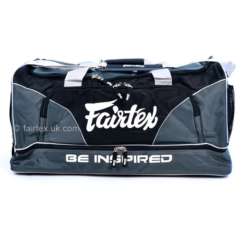 The Fairtex BAG2 Grey Heavy Duty Gym Bag is made from premium grade water-proof nylon. It contains a wet cloth compartment underneath and a large shoe or boxing glove compartment at one end with 2 mesh pockets at the other for a water bottle or other belongings. It also has a headphone socket at top with secure concealed MP3 player/phone pocket on the inside of the top opening. All zips are lockable.